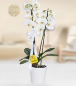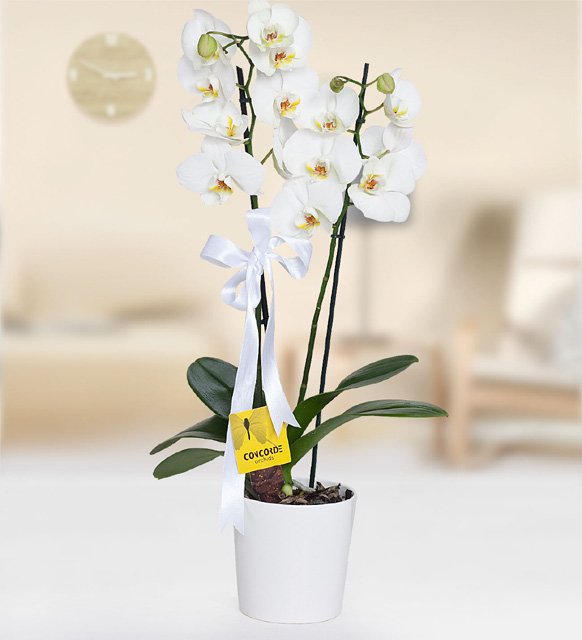 Seramik vazo içerisinde 2 li beyaz orkide.